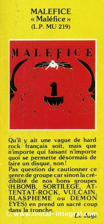 Je suis désolé mais j'ai un gros doute sur ton chiffre de 64000 albums vendus...On aurait du en voir partout dans les magasins d'occasion ou dans les conventions dès le début des 90's et selon moi ce ne fut pas le cas. Qu'as tu comme preuve irréfutable de ce que tu avances... PATRICK = J'imagine aisément ton doute, l'album était en vente en France, Italie, Espagne , Canada...d'où le fait de trouver cet album en vente sur des sites provenant de pays étranger. J'ai vu un album de MALEFICE a vendre sur eBay.com USA pour 80 USD! Je sais que certains groupes français bien plus connus du grand public on vendu moins que MALEFICE, certains d'eux avaient une distribution exclusivement française, il faudrait que je remette les mains sur mes relevés de droit SACEM, mais cela vas être dur, j'habitais à l'époque chez mes parents, j'ai déménagé huit fois depuis, Si ce nombre de vente peut porter préjudice pour ton site, cette information sur la quantité d'albums vendus n'est pas primordiale pour nous. 8/ Pour la promotion il y a eu des chroniques dans les magazines nationaux et j'imagine des fanzines, peux tu me dire ce dont tu te souviens de cette partie « promotion et retours » ?
